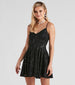 Sweet and flirty. this adorable skater dress is perfect for Homecoming season! It features a sleeveless V-neckline. adjustable spaghetti straps for a customized fit. a high waist seam. and a short skater skirt with a fit and flare silhouette. The lined lace fabric features all-over sequin embroidery for the prettiest shine. Complete the look with platform heels.