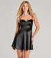 You'll be looking so sweet in this satin skater dress for every dressy celebration! The dress features a sleeveless sweetheart neckline with flirty ruffle trim. spaghetti straps. seam detailing along the bust. and a flattering short-length hem. Complete the look in strappy stiletto heels.