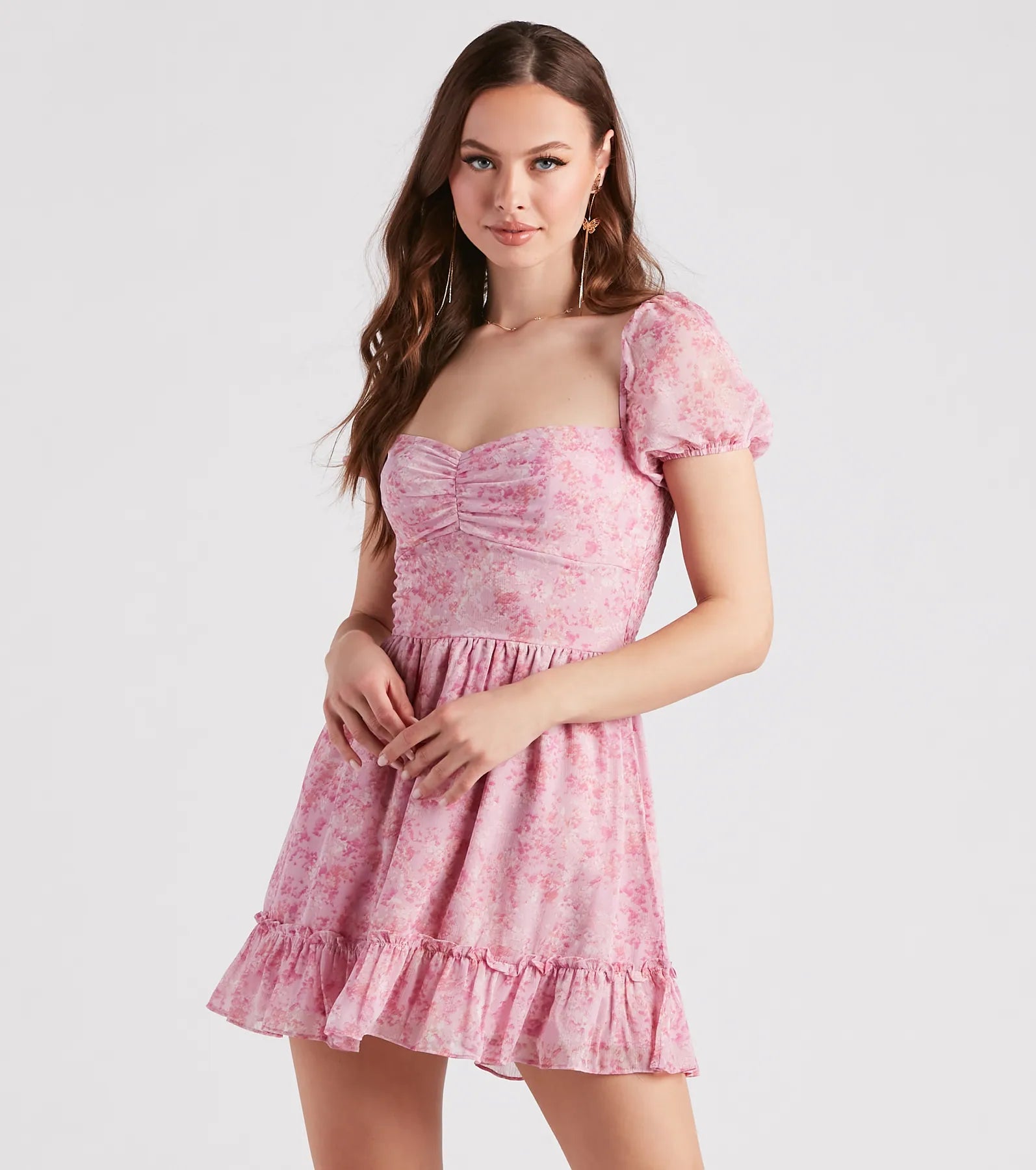 This adorable floral skater dress will bring those sweet spring vibes to your look! It features a sweetheart neckline. short puff sleeves. a high waist. a short skater skirt with a ruffled hem. and a fit and flare silhouette. The lightweight chiffon fabric features a dainty floral print pattern. Style with strappy sandals.