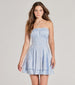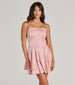 The short skater dress is made with a silky satin woven fabric detailed with a brocade floral pattern. The dainty ruffled trim on the strapless sweetheart neckline adds a sweet feminine touch. while the corset bodice snatches your waist. leading to a short fit-and-flare skater silhouette for the perfect coquette vibe. Style with lace-up heels for homecoming or a party.