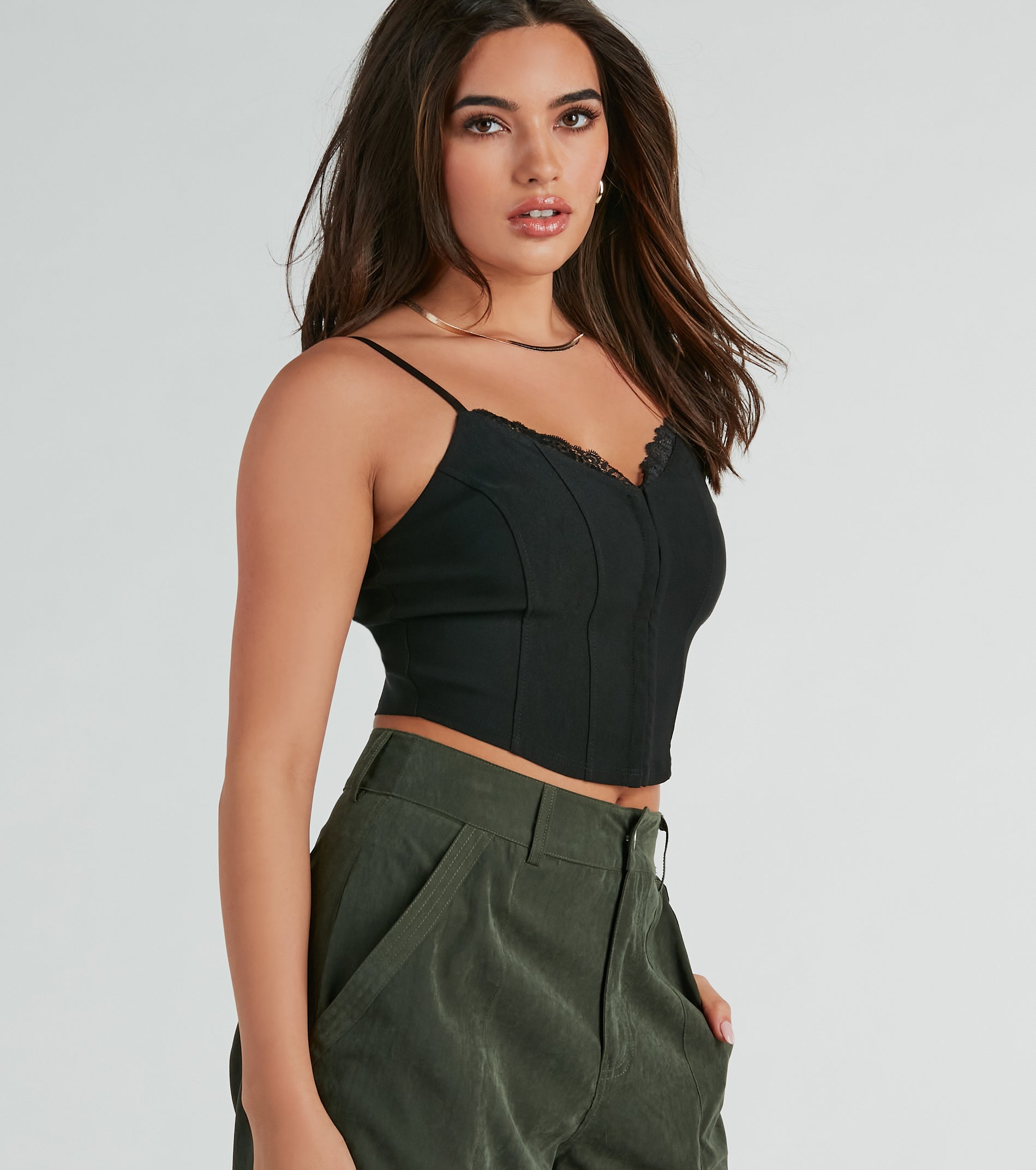Turn heads in this sweet woven corset top for a stunning vibe with your favorite bottoms on casual dates or hangs with the girls! Crafted from smooth woven fabric. this corset crop top brings the flirt factor with a lace trim V-neckline. adjustable spaghetti straps. and hidden front hook and eye fasteners so you can get the perfect fit. Complete the look in best-selling bottoms. mules. and a purse.