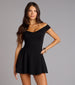 The little black dress. upgraded—this off-the-shoulder mini dress brings flirty flair with a sweetheart neckline and playful skater silhouette. Perfect for everything from date nights to nights out with the girls.
