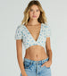 Get ready for those sweetheart vibes in this strappy floral crop top! This playful top features puff short sleeves and a plunge V-neckline for a flirty touch. The strappy open back with tie closure adds a unique and charming detail. while the cropped hem and rose print fabric make it perfect for any summer occasion. Complete the look with denim jeans.