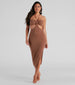 You'll be ready for a fab weekend getaway in this curve-hugging midi dress! It features a sleeveless sweetheart neckline with halter straps. chic waist cutouts. and a midi-length. form-fitting silhouette with a thigh-high side slit. Complete the look with sleek hoop earrings.