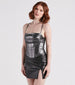 Look disco chic in this metallic corset top for your next night on the town! It features a sleeveless cowl neckline. spaghetti straps that cross along the back. flexible boning inserts. and a fitted crop hem. Complete the look in a sultry mini skirt.