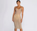 Bring the sparkle to light up the night in this dazzling midi dress! It features a sleeveless bodice. a plunging sweetheart neckline with a built in no slip strip. molded padded cups with underwire for support and a double row of spaghetti straps. The slim fit bodice leads to a curve hugging midi length silhouette. Dress is composed of a sheer mesh fabric embellished with heat stones throughout. Includes a bodysuit-like contrast bottom lining and a back zipper closure. Garment offers a curve hugging fit with a moderate stretch.