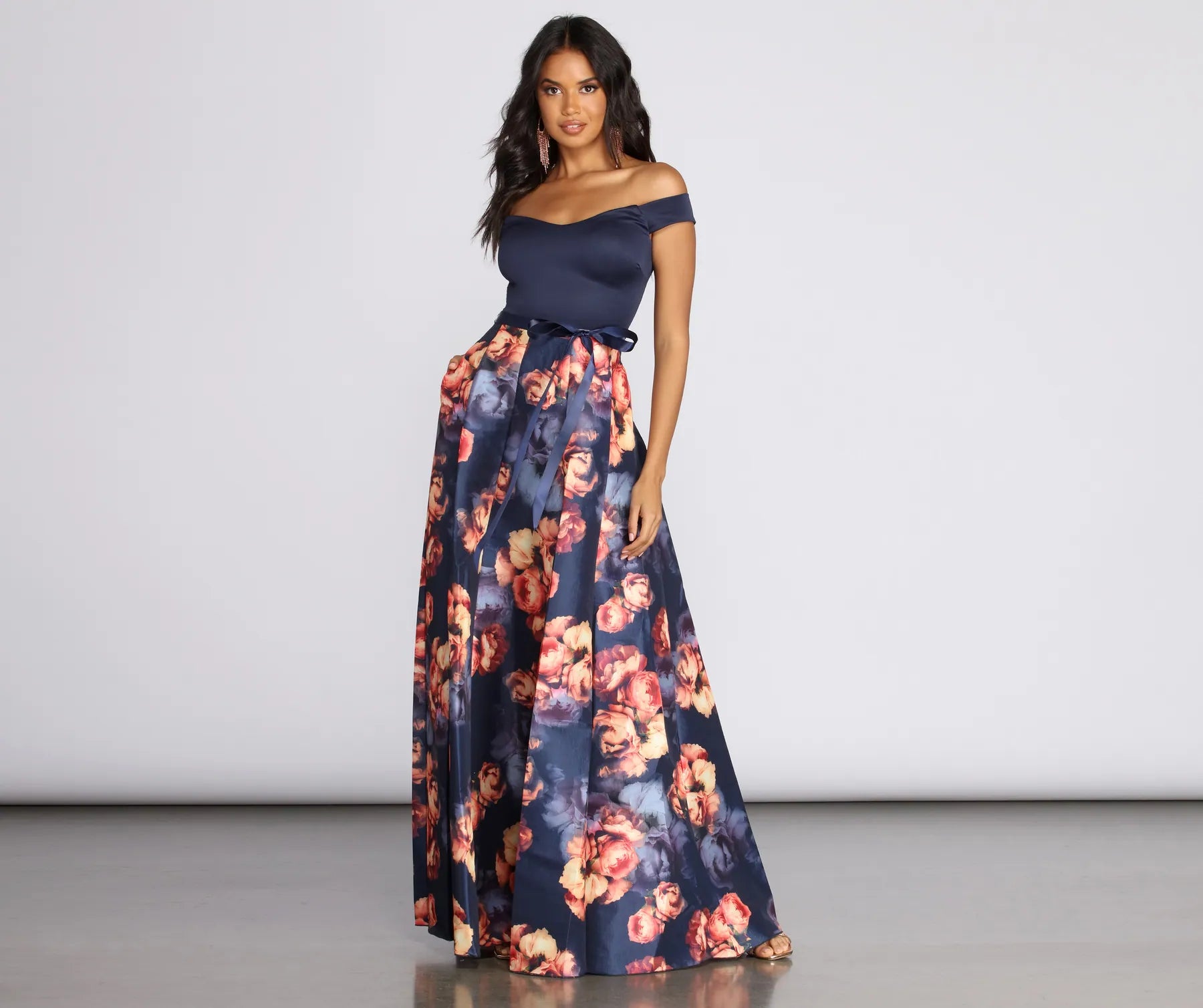 Make it special in the Tatianna gown! She features a straight neckline. padded cups. off shoulder sleeves. and a zipper closure at the back. Bodice is fitted and comosed of a nylon material that offers moderate stretch. Bodice meets skirt high waist with a ribbon accent and flows out with an A-line design. Dress has a mini skirt lining and skirt is composed of a taffeta material that showcases a floral pattern and a sheen finish. Best of all dress includes pockets!