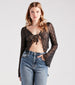 Look and feel like a total babe in this textured crop top perf for spicing up your everyday style! It features bell long sleeves. an open tie-front design. and a cropped hem on sheer mesh fabric with texture stitching. Complete the look in sleek faux leather shorts for a night out!