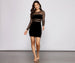 Hey. VIP! Stun in a glitter mini dress for your next GNO or for a fancy date night with bae. The dress features a crew neckline. a partially unlined sheer glitter mesh bodice. long sleeves. sheer waist accent. The mini length skirt is composed of lined velvet fabric. Complete your night out look with clear mules.Â