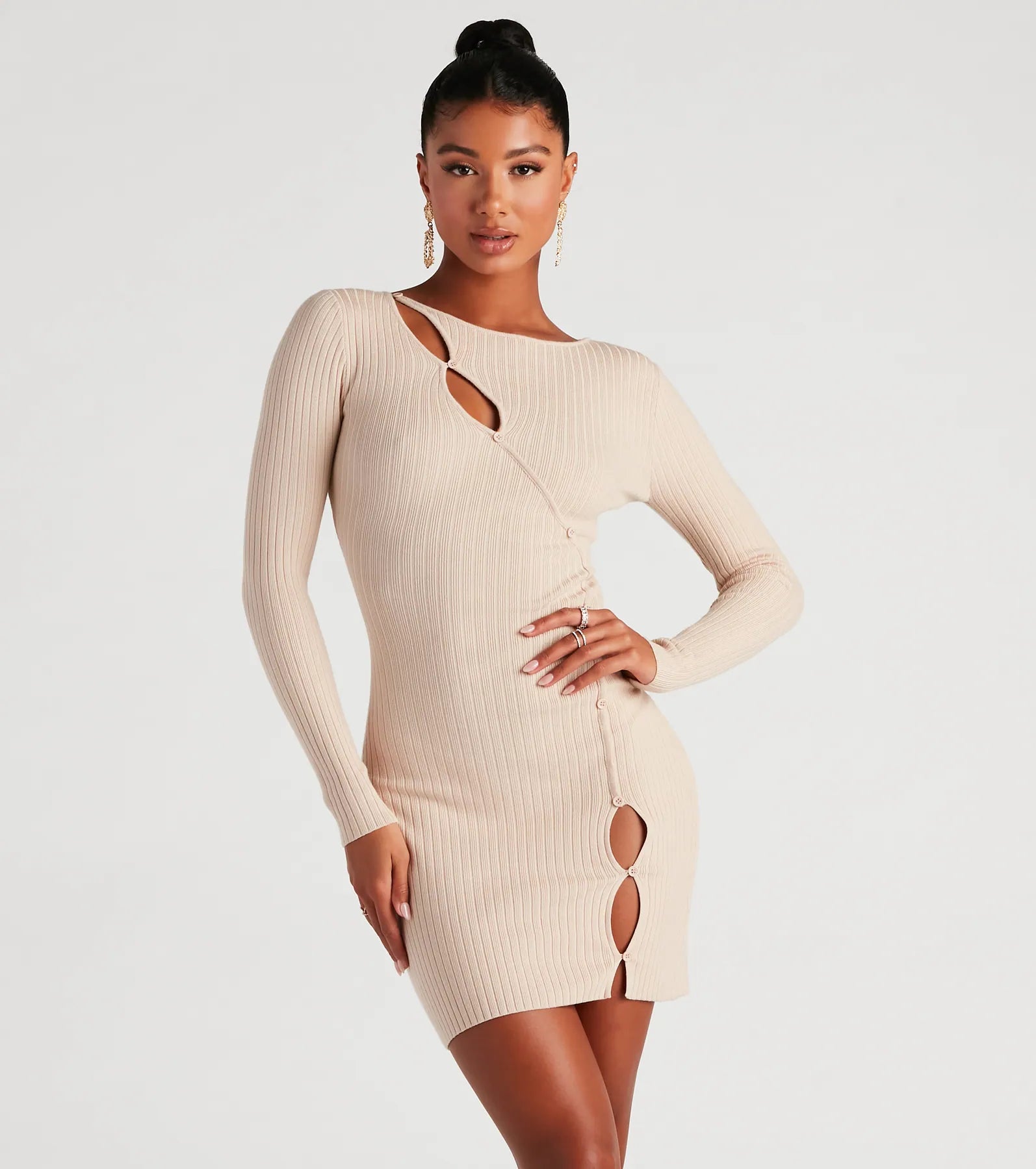 Babe. you'll be looking stunning from all angles in this sweater mini dress featuring a crew neck. long sleeves. front keyhole cutouts. button accents. and a bodycon silhouette on rib-knit fabric. Style with knee-high boots to complete the look.