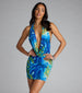 If stares could speak. they'd say. “who is she?" With a cowl plunge halter neckline and marble print that demands the spotlight. this mini bodycon dress was made to make moves.
