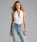 Elevate your going-out look with this denim corset top boasting a sexy plunge halter neck and lace-up sides sure to receive many compliments!