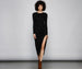 Take your look to the next level with a midi dress that demands drama! The dress features a crew neckline. long sleeves. a high side slit. and a midi-length silhouette. The dress is composed of a smooth knit fabric that offers a form-hugging fit with a moderate stretch. Complete look with ankle booties.