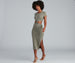 You've got knit on the mind. show off in a midi dress that stuns! The dress features a crew neckline. short sleeves. a knot accent at the center with dual cutouts at the waist. and a midi-length silhouette that is accented with a high side slit. The dress is composed of a cotton knit fabric that offers a form-hugging fit with a moderate stretch. Complete look with mules and a clutch.