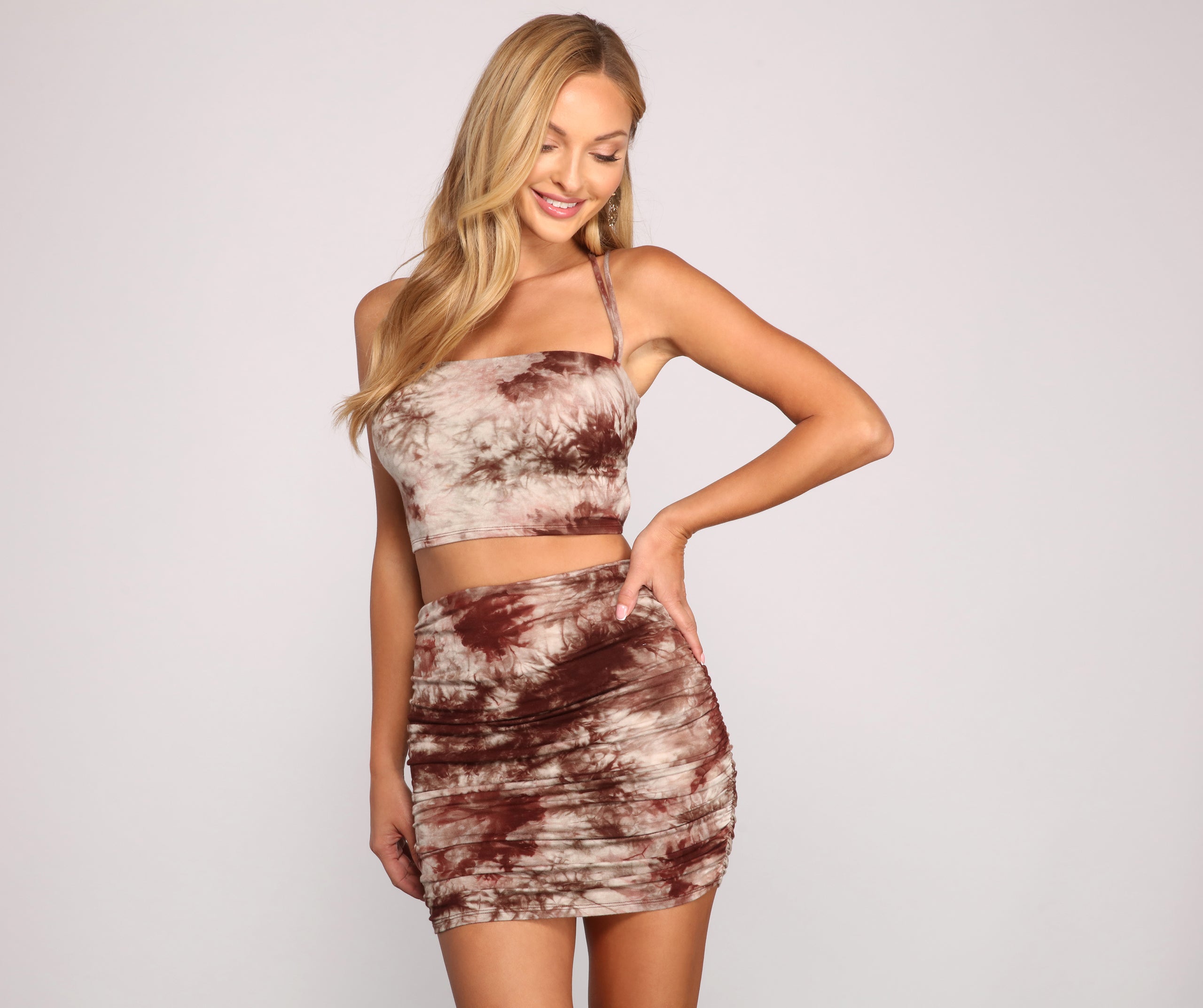 Show off your love for tie-dye with a cute crop top! The top features a tie-dye pattern. a sleeveless square neckline. spaghetti straps. a lace-up back. and a cropped hem. Complete the look with the matching mini skirt.