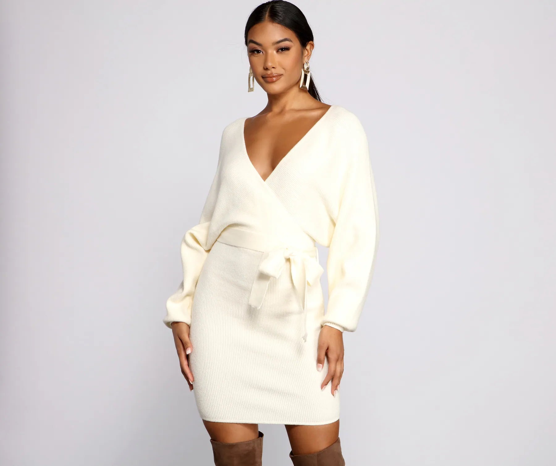 Get an adorable look perfect for a casual date night in this mini sweater dress! It features a wrap front and back with a front tie detail and a short. curve-hugging fit. Pair the dress with chic thigh-high boots for a gorgeous fall-time vibe.