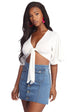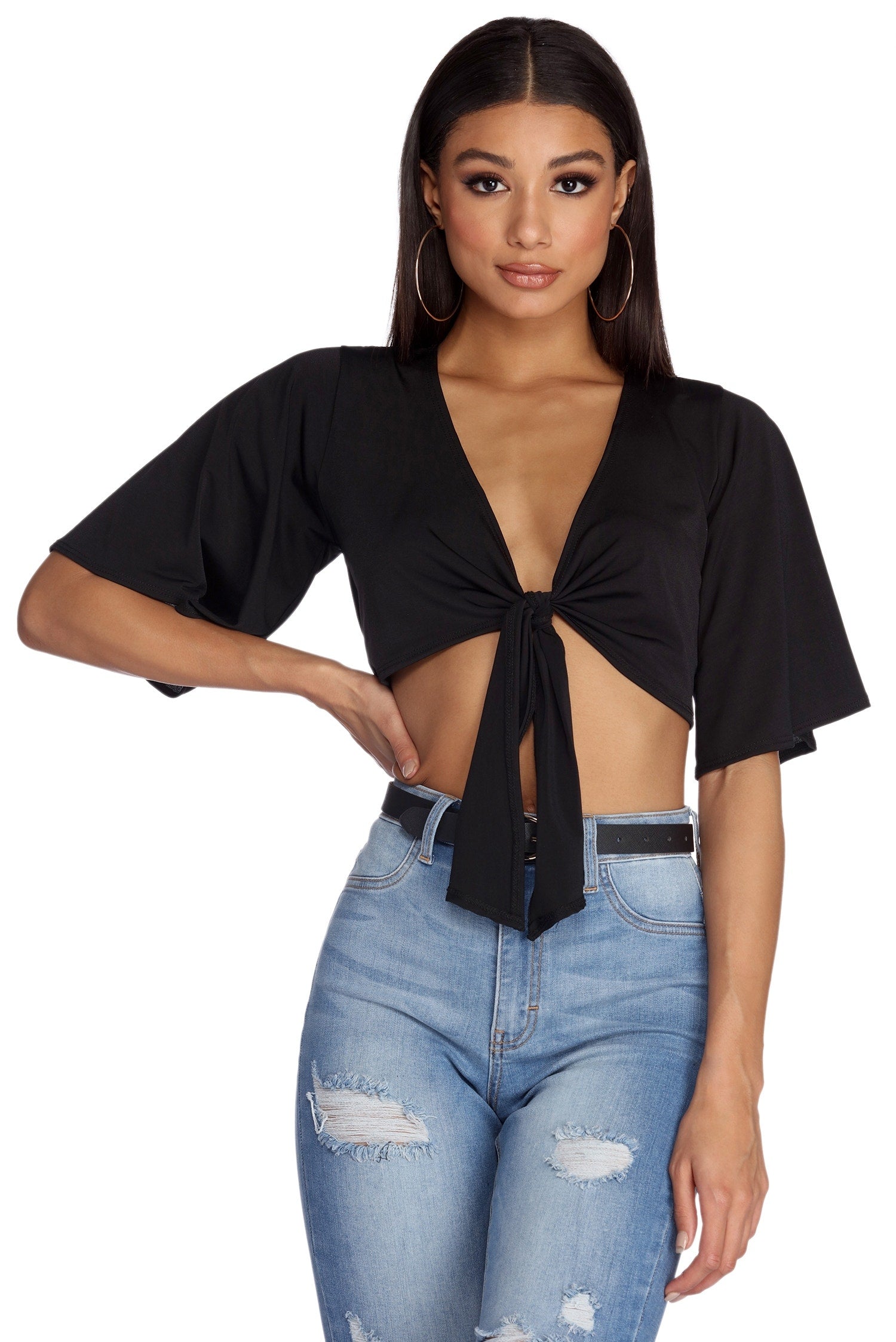 Get tied to fashion with this cute tie front crop top! It features short. flowy kimono sleeves. a drape open front with a tie closure. and a cropped hem. The tie front top is composed of a smooth knit fabric with plenty of stretch.