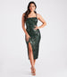 Beautifully designed with sparkly sequins. the Tilda formal midi dress brings shine to award banquets. weddings. and dressy birthdays! She features a sleeveless one-shoulder neckline. and dual adjustable spaghetti straps. a lightly padded bust. a form-hugging silhouette. and a skin-flaunting front slit along the midi-length hem. The formal knee-length midi dress is composed of a sequin-scroll pattern on mesh fabric with a stretchy knit lining. Complete the look in sassy block heels.