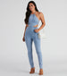 This trendy denim catsuit will have you totally weekend-ready! It features a sleeveless halter neckline. side cutouts that lead to the back. a high-rise waist. and a form-hugging fit throughout the leg. Style this catsuit with strappy mules and chic shades.