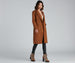 Keep it timelessly chic with a trench coat that layers over your sophisticated outfits. The trench features a collared neckline with lapels. long sleeves. a double-breasted button closure. hidden front pockets. and a longline hem. The coat is composed of a lined faux wool fabric that offers a relaxed fit with minimal stretch. Complete look with thigh-high boots.