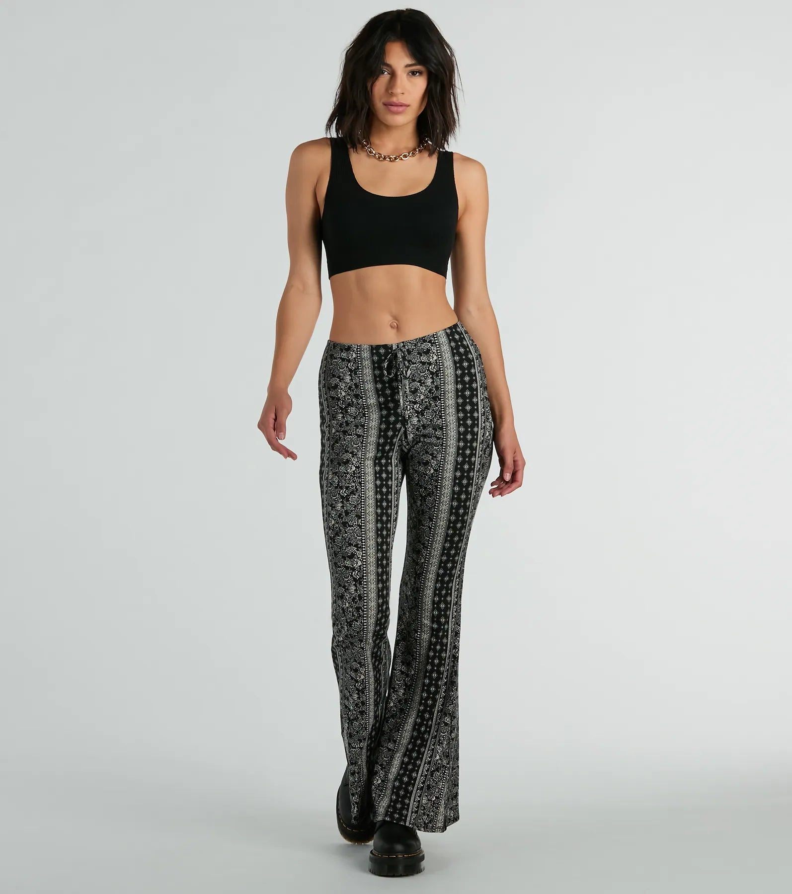 A boho-inspired print adds carefree charm to these flare pants perfect for festivals. concerts. or daytime adventures! Made with soft brushed knit fabric. these boho pants will keep you comfortable and stylish all day long. The high-rise V-waist and adjustable scrunch tie create a flattering. hip-hugging fit. while the flared hem adds a touch of playful movement. Complete the look in a cute crop tee and platform shoes.