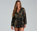 Make a toast to glamour with a sequin romper that brings major glitz. The romper features iridescent sequins. a plunging wrap V-neckline. partially sheer long sleeves. a tie-waist belt. and wide-leg shorts. Complete look with a sphere clutch and mules.Â