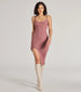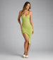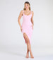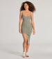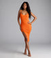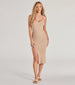 This sleeveless ribbed knit midi dress features a striking V-neckline and bodycon fit with a front slit detail for movement. Perfect for layering with a jacket and heels.