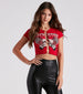 Put on an epic show with this graphic tee featuring short sleeves. a crew neck. front safety pin trim and cutout. a front text that reads. " Rock Star" and a cropped hem. Style with sleek skinny pants to complete your edgy look!