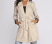 Bring your blazer game back to life! This trench style coat features a long collar. two pockets and hem that hits above the knee. The neutral tones make it easy to pair with most outfits. and the touch of leopard print at the cuff adds a little edge to your style. Wear open or tie closed with the tie yourself belt.