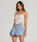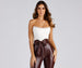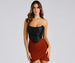 Stay on trend with a corset that is perf for those Insta-worthy moments! The corset features a strapless square neckline. contrast piping with flexible boning. a mesh overlay. and a cropped hem. The corset is composed of a faux leather fabric that offers a form-hugging fit with minimal stretch. Complete look with high waist jeans and mules.