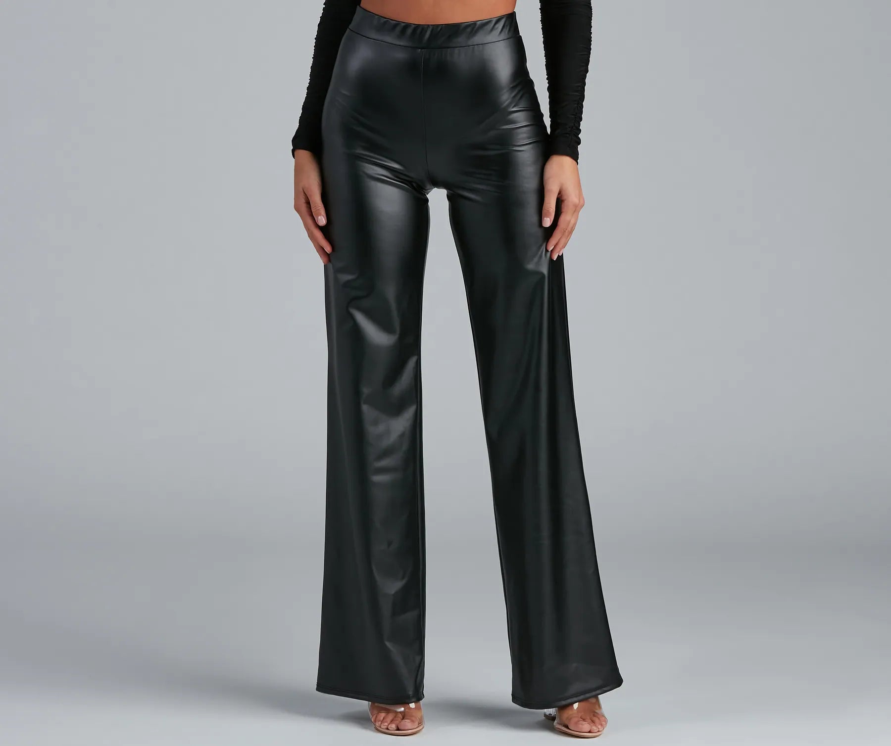 Have yourself a trendsetting moment in these chic and sleek faux leather pants. They feature a high-rise elasticized waist and a wide-leg fit with a flared hem. Style these pants with a crop top and strappy mules.