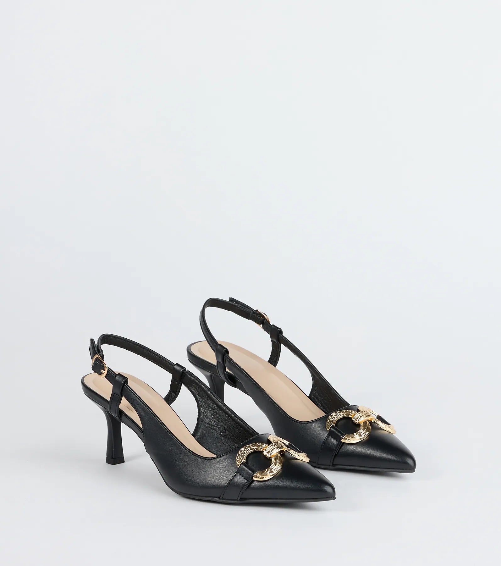 So sleek. these slingback stiletto pumps feature circular buckle accents for a trendy touch.