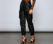 These trendy-chic faux leather joggers will stylishly elevate your look. They feature a high-rise waist. a hidden front zipper and hook and bar closures. side pockets. cargo-style pockets. a relaxed fit. and a tapered jogger hem. Pair these joggers with a cute crop top and clear heels.