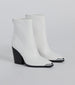 Add a trendy edge to your everyday 'fits with these sleek faux leather booties. They feature an above-the-ankle height. a chic asymmetric stitched design. a square-shaped toe with a shiny metal toe cap. a back zipper closure for easy on-and-off styling. and a stacked block heel. Pair these boots with hoop earrings.