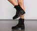 Add a little sparkle to your style in these edgy-glam combat booties! They feature an above the ankle design with back pull tabs. a round toe. a lace-up front. a lug sole. and a short heel. The booties are composed of a glitter material with patent faux leather accents. Pair these booties with a mini dress and a faux fur coat.