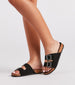 These buckle-strap sandals are a trendy must-have for the spring and summer seasons! They feature a round toe. a two-strap design with adjustable buckles. an open back for easy on-and-off styling. and a flat sole. Style with hoop earrings and a layered necklace.