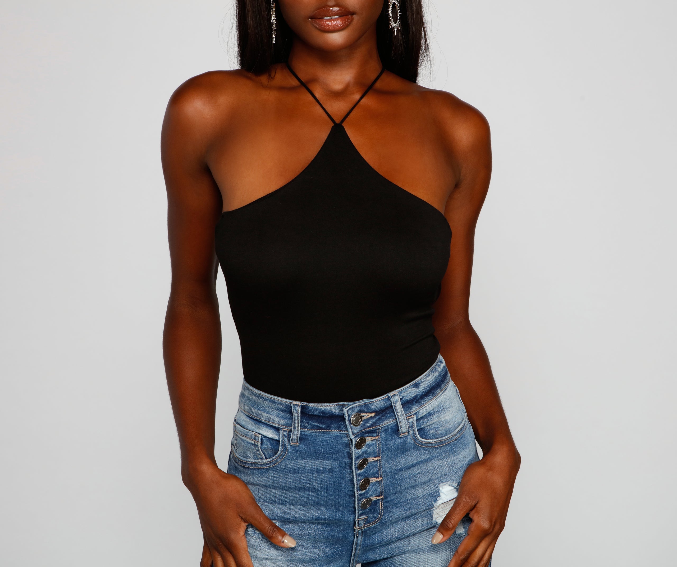 This trendy basic has a cool strappy back design for an elevated vibe. The bodysuit features a sleeveless halter neckline. spaghetti straps that lead to an open-back strappy design with small O-ring details. and a form-hugging fit. Style this bodysuit with high-rise jeans and chic mules.