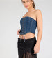 Unlock this trendy denim corset top boasting a strapless neckline and a lace-up front design for a stylish look. Pair with jeans.