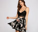 Create a twirl-worthy moment with a mini dress that is part sweet. part sultry! The dress features a sleeveless V-neckline. a partially unlined floral lace bodice. adjustable spaghetti straps. a sexy waist cutout. and a skater silhouette with a floral print. The dress is composed of a lace and stretchy smooth knit fabric that offers a form-hugging fit. Complete look with heels and door knocker earrings.Â