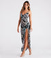 This bold and alluring tropical print maxi dress calls for a trip to paradise! It features a sleeveless V-neckline. spaghetti straps that lead to a cross-back design. a floor-length hem with a thigh-high front slit. and a flowy silhouette. The smooth knit fabric showcases a tropical palm leaf print. Style with strappy sandals for sunset drinks.