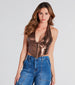Your true essence is to shine! This metallic crop top will put the spotlight on you. It features a halter plunge V-neckline. an elasticized scrunched neck strap. an underwire bust. flexible boning and hidden hook and eye closures. and an open back. Complete the look in a fab mini skirt for a bachelorette or party!