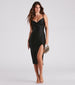 Try to resist not staring at yourself in this sultry midi dress with every mirror you pass! The dress features a sleeveless V-neckline. sleek spaghetti straps. a surplice pleated bust with lining. and an empire waist seam leading to the form-hugging silhouette and a skin-flaunting slit. Complete the look in stiletto heels.