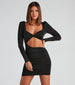 Create a meant-to-be moment in a short dress that makes an unforgettable impression! This updated LBD features a twist-front sweetheart neckline. an asymmetrical cutout at the midriff through the waist. long sleeves. and ruching at the waist through the hem. The dress is composed of a lined smooth knit fabric that offers a form-hugging fit with a moderate stretch. Complete look with rhinestone heels and a quilted faux leather handbag.Â
