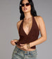 Flirty in the front. unexpected in the back—this halter crop top shows off with a plunging neckline and twisted strappy design that's all about the details.