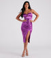 Luminous shine enchants the Twyla formal satin midi dress showcasing sultry detail that won't go unnoticed at banquets or ceremonies! She stuns in a sleeveless sweetheart neckline with a twisted bust. keyhole cutout. adjustable spaghetti straps for a customizable fit. and a front ruched seam leading to the skin-flaunting slit. The formal midi dress is composed of a lined satin fabric that hugs your body like a glove and has a sheen effect. Style with embellished heels to complete the look!