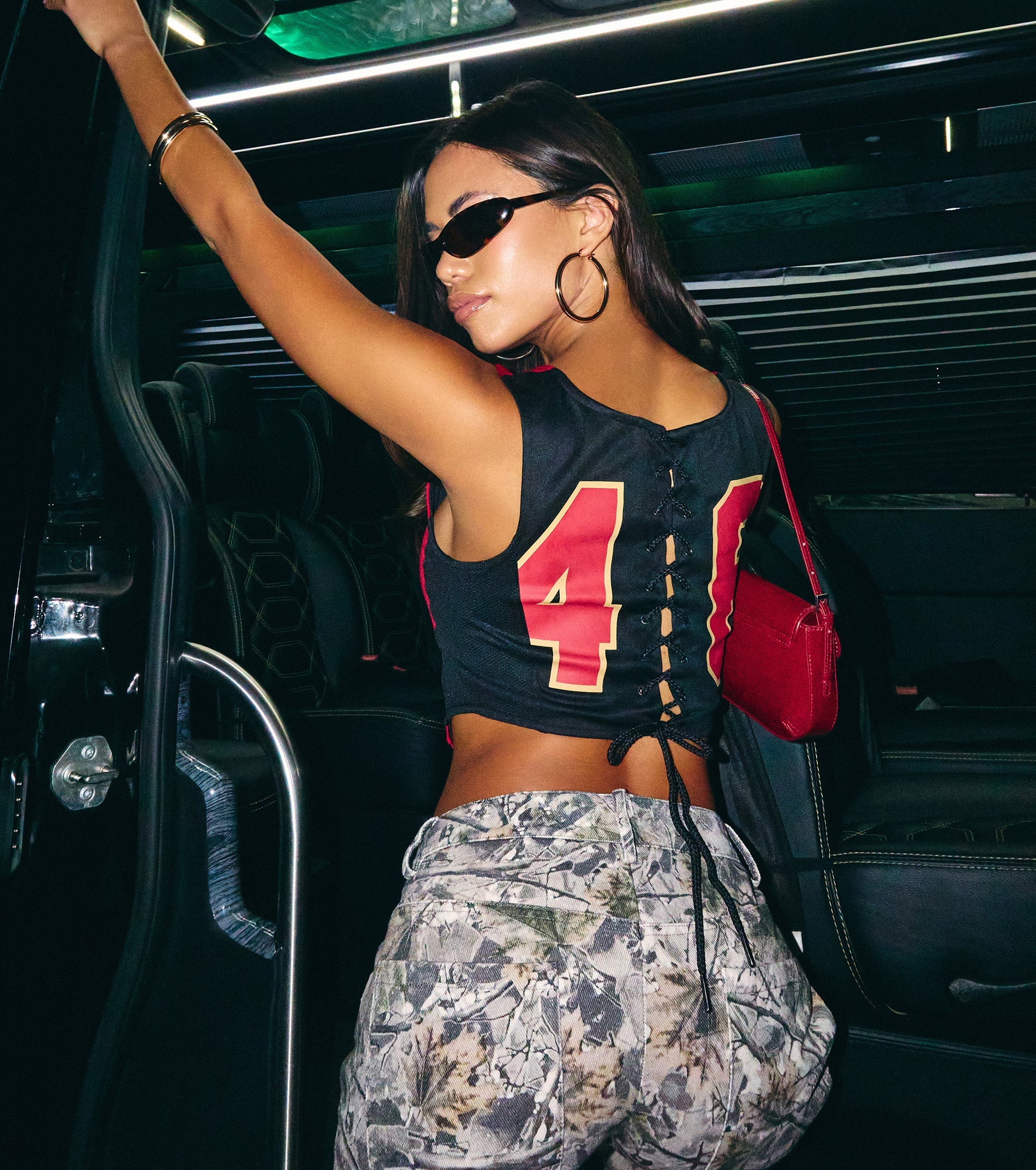 Game day just got hotter—this tank top is laced up and ready to score. With its corset-inspired fit and bold San Francisco 49ers graphic. it's the perfect mix of sporty and sultry.