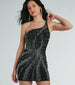 Unlock an undeniable glow in this one-shoulder mini dress for your next night on the town! Showcasing faux pearl. rhinestone. and gemstone embellishments on lightweight mesh fabric. this party dress is here for the glamour girls. Features a flattering bodycon silhouette and a sassy mini-length hem. Complete the look in strappy heels and a clutch!