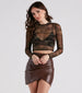 You'll be a total undercover cutie in this sultry sheer crop top! It features a crew neckline. long fitted sleeves. a fitted. cropped hem. and an all-over camouflage print on the airy sheer mesh fabric. Style over a bralette with a faux leather mini skirt for a night out.