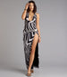 Go full wild mode in this zebra mesh dress—plunging cowl neckline. open back with tie straps. and a daring thigh-high slit. The hardware trim at the waist adds just the right amount of edge for a dress that owns every room.