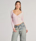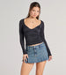 Update your basics with this stylish crop top! Designed with fitted long sleeves. a V-neckline with underbust seam detailing. and a ruched fitted silhouette that flaunts your figure. Pair with a mini denim skort.